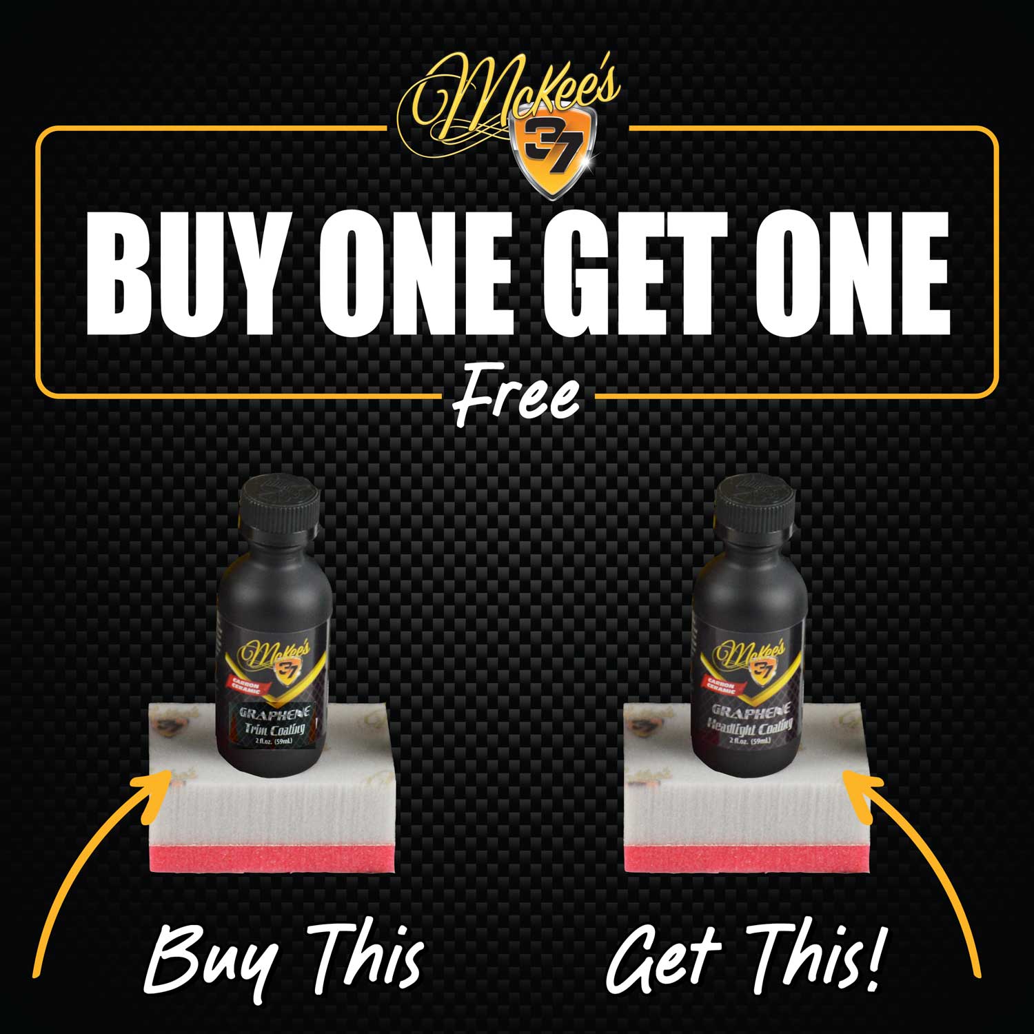 This week purchase a bottle of McKee's 37 Graphene Trim Coating and Receive a FREE bottle of Graphene Headlight Coating! Retail Value of $59.99 - FREE! Note: You Must Add BOTH products to your shopping cart. This special offer is not applicable for additional discount codes or promotional offers. Available while supplies last.