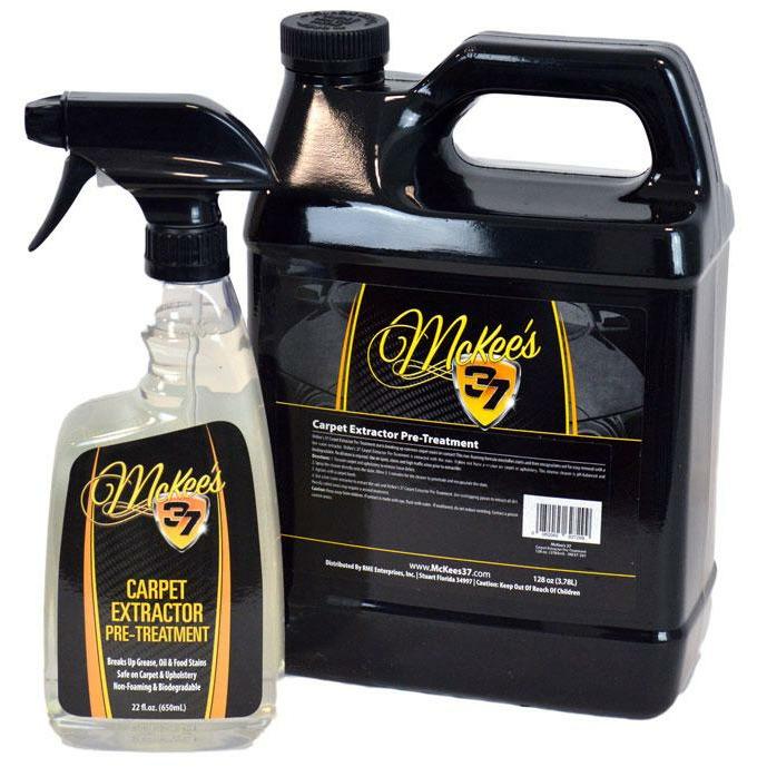 Use McKee's 37 Carpet Extractor Pre-Treatment on spots, stains, and high traffic areas prior to cleaning your carpet and upholstery with a hot water carpet extractor or before cleaning by hand with a carpet brush and vacuum. The unique enzyme formula breaks up the worst stains on your vehicle's carpet and upholstery.