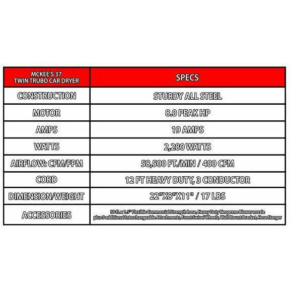 The McKee's 37 8.0 HP Twin-Turbo Car Dryer with 30 Foot Hose blasts heated, filtered air. If you know anything about keeping your vehicle swirl and scratch free, then you know the best path to maintaining a flawless finish is by touching the vehicle as little as possible. The fact of the matter is, most swirl marks and scratches are inflicted with inexpensive drying towels and reckless technique. Go the touch-less route by drying your vehicle with the McKee's 37 8.0 HP Twin-Turbo Car Dryer with 30 Foot Hose. You'll never look back, trust me!