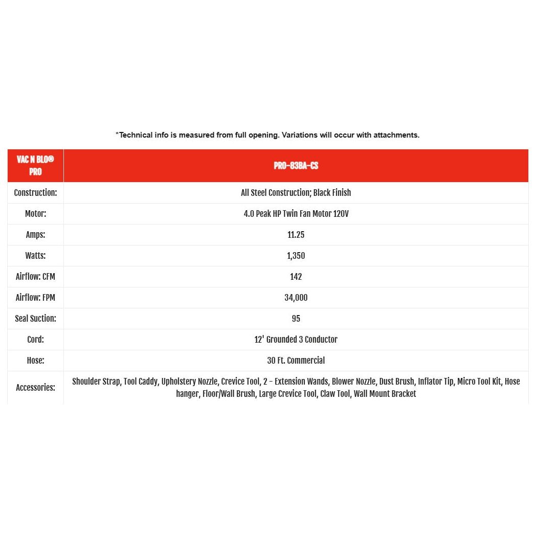 Conveniently mounts to the wall with 30 feet of hose or you can effortlessly roll it to your favorite vehicle. The Vac N Blo® Pro Series features a steel body and a 4.0 Peak HP, twin-fan, industrial quality motor that produces an amazing 95" of water lift (the standard measure of vacuum efficiency). The machine is assembled with a 12 ft. grounded cord set.
