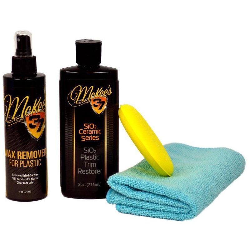 Combo Includes: 8 oz. McKee's 37 Wax Remover for Plastic 8 oz. McKee's 37 SiO2 Plastic Trim Restorer Premium Microfiber Towel Poly Foam Applicator