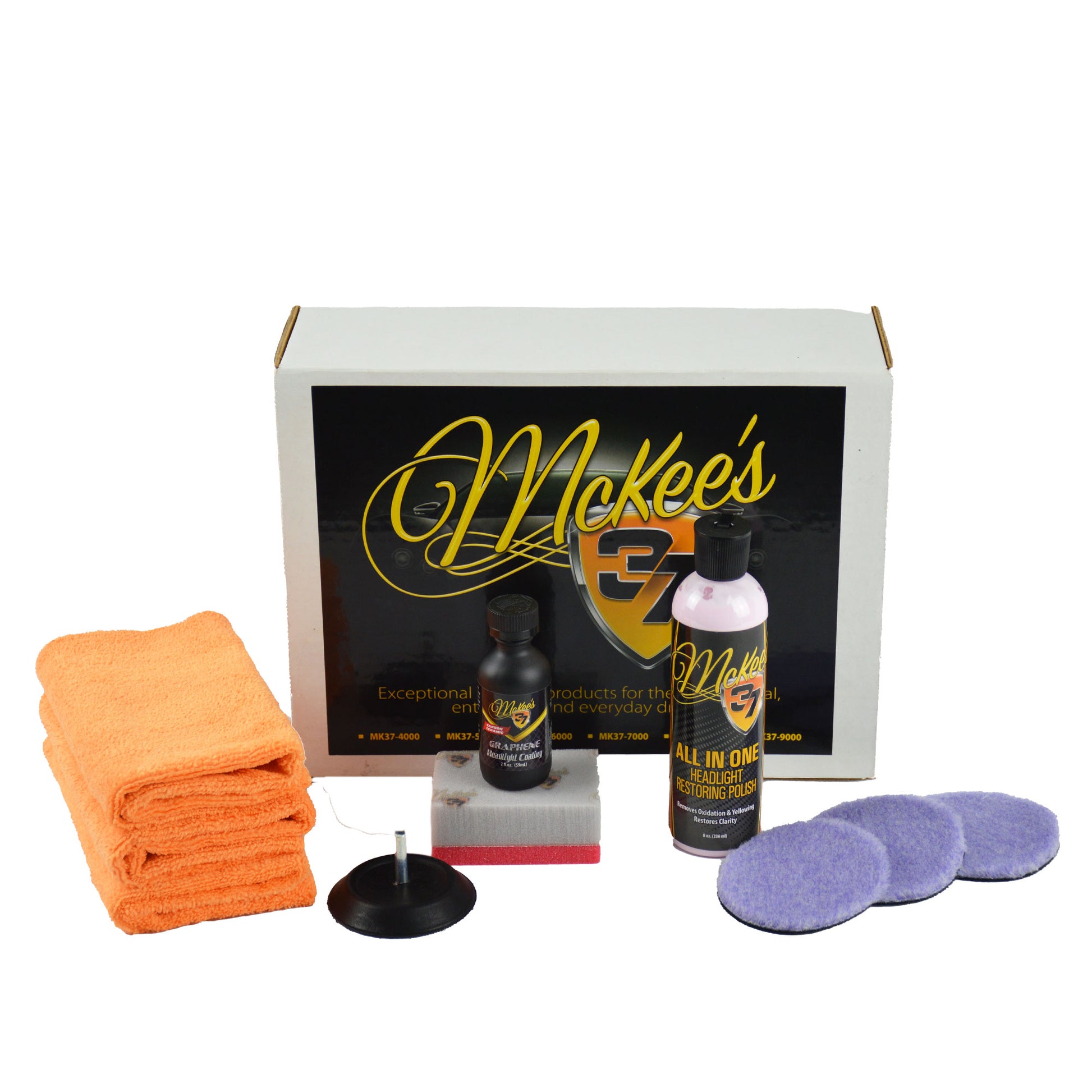 Kit includes: 8 oz. McKee's 37 All In One Headlight Restoring Polish 2 oz. McKee's 37 Graphene Headlight Coating Lake Country 3 Inch Drill Backing Plate 3 Qty Microfiber Detailing Towel, 16 x 16 inches McKee's 37 Coating Applicator 3 Qty 3 1/4 Inch Thin Foamed Wool Pad